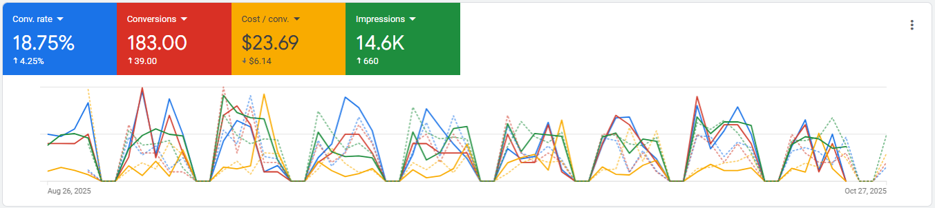 Across a 60-day period, the improvements were clear: conversions climbed to 183, the conversion rate rose to 18.75%, and the cost per conversion dropped to $23.69. These results show how consistent, data-driven adjustments can produce measurable growth and lasting efficiency for a dental PPC campaign.